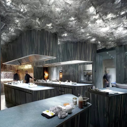 Three open cooking stations anchor the dining room at this three-Michelin-starred restaurant, where twins Sergio and Javier Torres orchestrate Mediterranean cuisine beneath sculptural clouds of light. The approach is deceptively simple: pristine seasonal ingredients, minimal manipulation, maximum impact. A signature cured squid paired with poultry consommé and caviar captures their sea-and-mountains philosophy, while five sommeliers navigate an exceptional cellar.