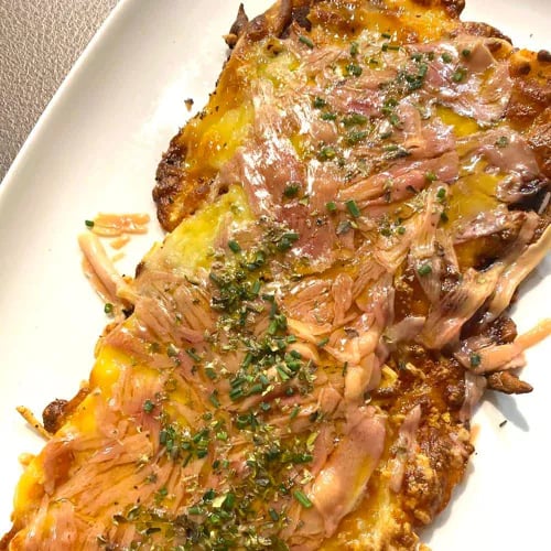 Chef Álex Sampedro's Bib Gourmand address occupies the fringe of Cimadevilla, Gijón's oldest quarter, where an urban, market-driven philosophy shapes each plate. The kitchen reworks regional classics with notable precision—foie gras pizza, hake balls in prawn sauce, house-style tripe—balancing subtle seasoning against fine textures. Diners choose between sharing plates at the entrance bar or the pared-back basement dining room below.