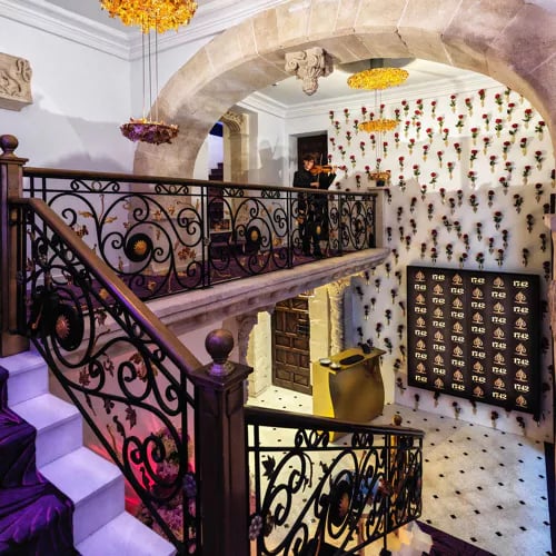 Perched in Dalt Vila's restricted upper quarter, this aristocratic mansion stages an evening of theatrical gastronomy under Dutch chef Edwin Vinke. Guests arrive by private transfer, greeted with champagne before touring ancient water cisterns and the wine cellar. The tasting menu spotlights Ibizan ingredients—organic vegetables, baby goat, red prawns—served in a dining room where lighting installations play across stone walls and a soprano performs live. Dessert unfolds on the panoramic rooftop terrace.
