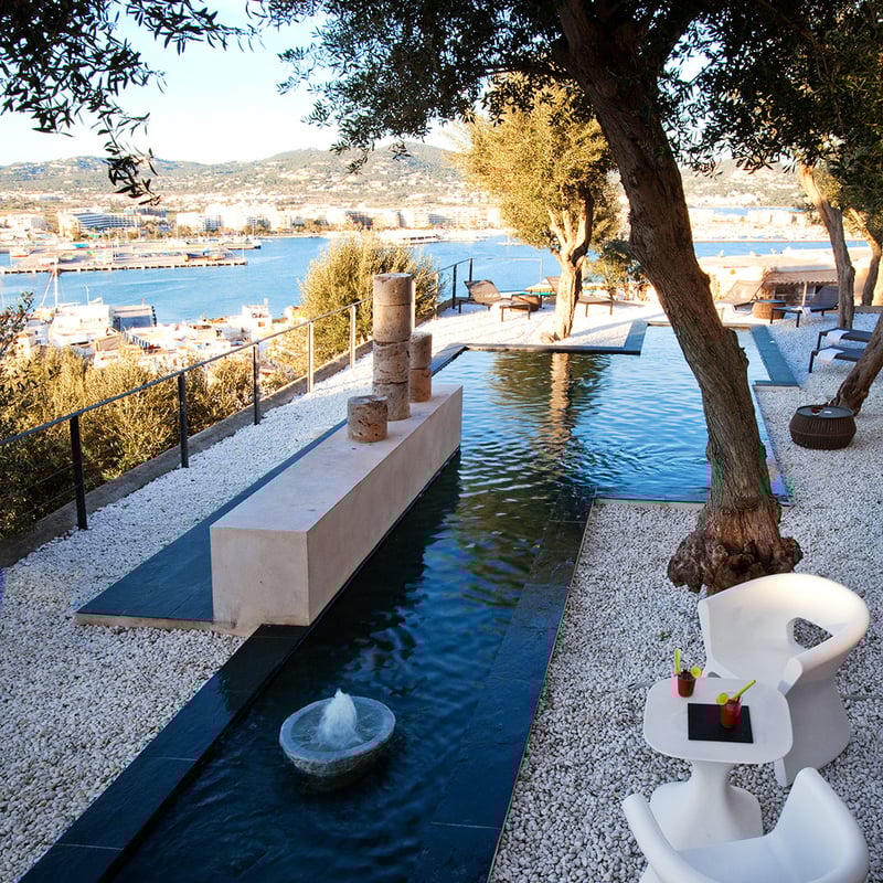 Three sixteenth-century buildings—complete with secret passageways and a medieval watchtower—form this 26-room retreat perched atop Dalt Vila's labyrinthine streets. Interiors pair exposed stone with minimalist whites and velvet accents, while the rooftop terrace and pool deliver sweeping views across the UNESCO-listed citadel to the marina below. An intimate address favored by those seeking seclusion amid Ibiza Town's energy.