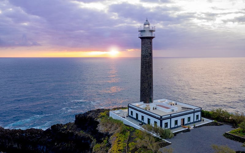 A functioning lighthouse on La Palma's northeastern coast — the first in the Canaries converted to accommodation — this intimate retreat pairs maritime heritage with striking design. Guests swim laps in an infinity pool overlooking the Atlantic, then retreat to a patio for evening wine as the beam sweeps overhead. The volcanic garden of cacti and black picón provides a dramatic backdrop, while a two-bedroom suite accommodates families seeking bragging rights.