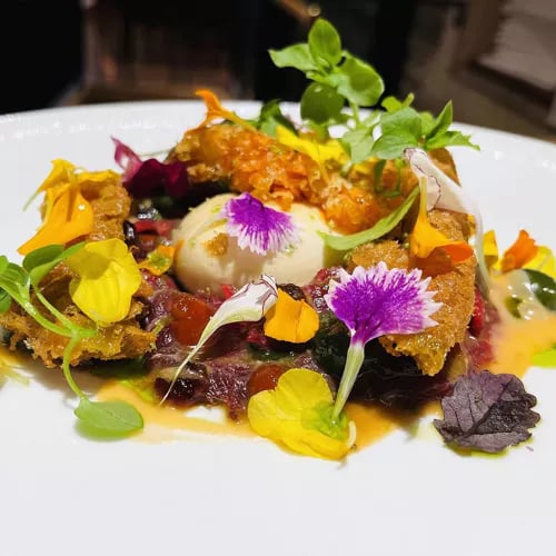 Paprica champions Galician farm-to-table cooking with vegetables from small organic producers and meats raised under strict animal welfare standards. The kitchen applies modern touches and subtle international inflections to regional traditions—chicken gyozas with balsamic and black beer, or the signature canelón de ropa vieja layered with Celtic pork, black chickpeas, and green turnip top mojo. A charming patio-terrace adds warmth to unhurried meals.