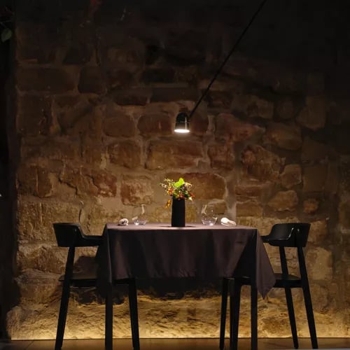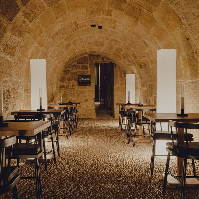 Inside a 17th-century bodega in Casalarreina, Lumbre channels Rioja's winemaking heritage into a theatrical dining sequence. Guests descend into ancient calados—the tunnels once used to age wine—for La Huerta appetizers before ascending through vaulted dining rooms. Three tasting menus (Origen, Fuego, Lumbre) showcase traditional cuisine, while an attic lounge extends the evening with digestifs beneath exposed beams.