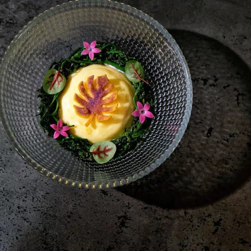 A former mechanical workshop in Zaragoza's Jesús district now hosts one of the city's most inventive tables, its vast skylight flooding the industrial bones with natural light. Guests progress through distinct spaces—aperitif sofas, the luminous Sala de la Luz, finally the open kitchen's counter—experiencing either the Chalado or Lunático tasting menu. Each succession of miniature courses demonstrates the one-starred kitchen's technical precision and bold contemporary vision.