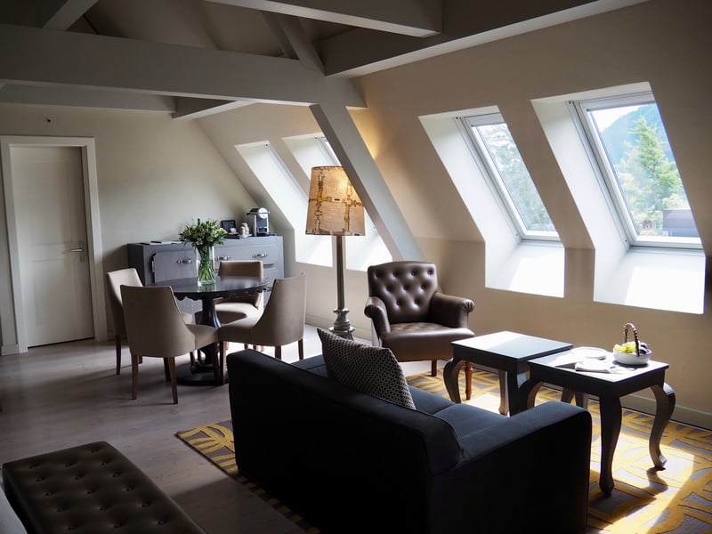 With 57 rooms (including 9 suites), Le Grand Bellevue offers an intimate setting. The rooms are divided into several categories, with the smallest (called “chic rooms”) already measuring 32m². As for me, I stayed in the aptly named Suite Sommet (“Summit suite”), situated on the top floor with a beautiful view of the village below. Spread over 62 m², the suite includes a king-size bed, a lounge area with a sofa, and a large table where we were able to enjoy a private breakfast in the morning. The rooms are very well-lit, featuring a chic and classy décor, while the superb bathroom is the icing on the cake, with a freestanding bathtub overlooking the forest.