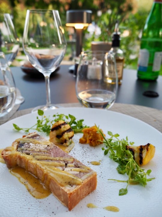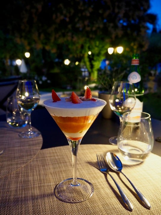We settled into the outdoor seating area at La Véranda in a pastoral ambiance to enjoy a three-course set menu, enhanced by an assortment of wines. From the menu for this summer, we began the meal with a duck pâté en croute with foie gras. A fantastic treat that I won't soon forget! Next up was a sea bream filet, simply exquisite. For dessert, a seasonal delicacy: apricot compote with pine nut cream, strawberry coulis, and lavender-olive oil ice cream. I completely fell for this original and flavorful dessert, which nevertheless was a light end to our meal. As for the service personnel, they were sophisticated and thoughtful, demonstrating a professionalism which, combined with the delicious cuisine, helped us to enjoy an excellent evening.