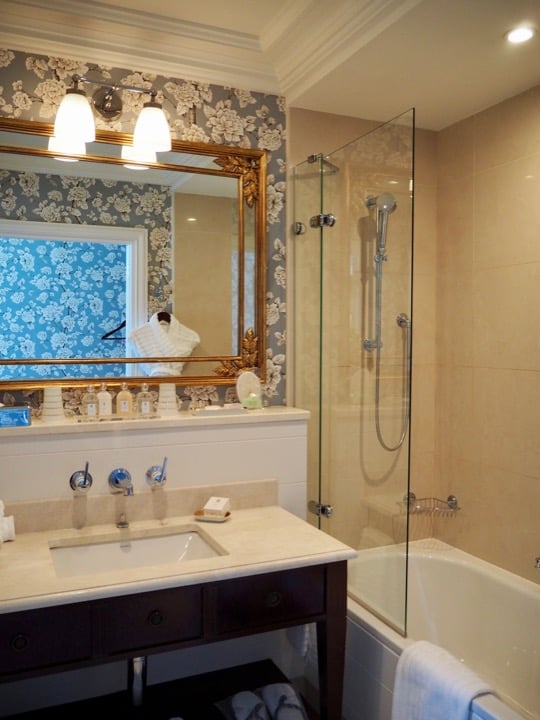 Next I headed up to my abode for the evening: the Junior Suite with lake view! Spacious and luminous, it includes a small balcony for admiring the view of Lake Geneva. The classic décor works perfectly with the building's historic look, embodied in details such as the lovely pastel blue and beige floral pattern on both the curtains and the duvet. To perfect this period style, there's nothing like a grand fireplace with imposing armchairs to make up the living area.