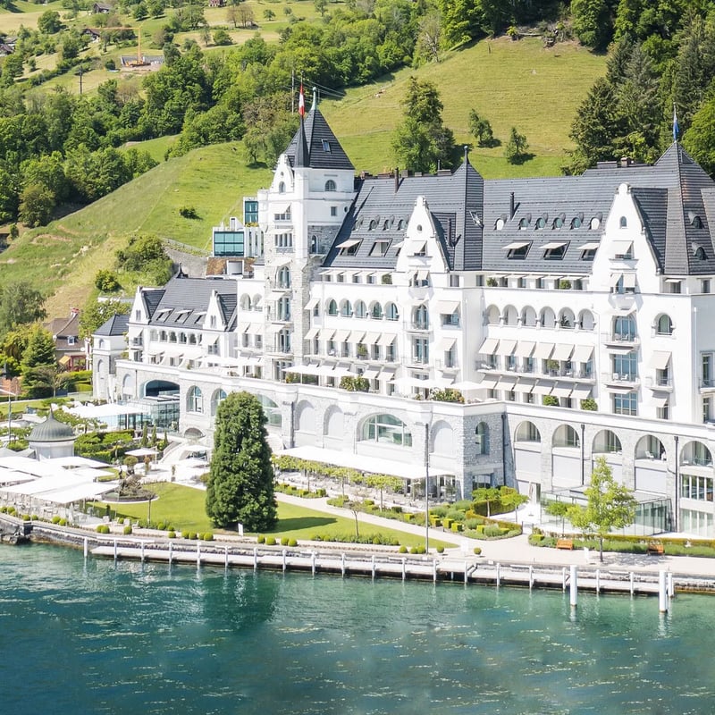 A turreted castle from 1903 commands the Lake Lucerne shoreline, its heated infinity pool suspended between alpine peaks and glassy water. The two-Michelin-starred Focus Atelier delivers creative French cuisine, while six cellars guard more than 32,000 bottles for private tastings. Below ground, the spa conceals an ice grotto and floor-to-ceiling saltwater aquarium—ideal respite before skiing Mount Rigi or Pilatus.