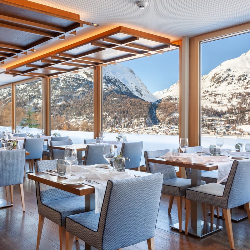 Twin dining rooms within Badrutt's Palace—Le Restaurant and Le Relais—deliver fusion cuisine with theatrical flair: tartare and flambées prepared tableside by a polished service team. The wine list draws from premier vineyards, matched to dishes built on exclusive ingredients. Morning guests secure tables overlooking lake and peaks, turning breakfast into an Alpine spectacle. Michelin Plate distinction.