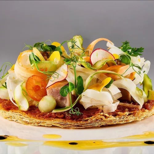 Claudia Canessa channels Peru's culinary diversity beneath the vaulted ceilings of Kulm Hotel St. Moritz, her modern-inflected dishes drawing on indigenous techniques and vibrant ingredients. The signature El Choclo y sus Gambas—grilled corn cake layered with red prawns, pickled onions, and creamy ocopa—exemplifies her inventive approach, while the Tuna Chicano ceviche delivers bright, clean acidity. A Michelin Plate destination for adventurous palates seeking altitude with attitude.