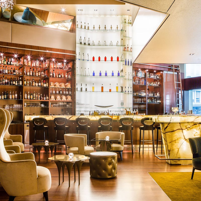 A Sol LeWitt mural commands the double-height lobby of this contemporary landmark steps from Bahnhofstrasse and Lake Zurich. The aesthetic runs toward warm minimalism—clean lines, glass facades, rooms dressed in Carrara marble with deep soaking tubs. Dining centers on parkhuus, where a wood-burning oven anchors an open kitchen turning out refined Swiss cuisine, while the onyx-paneled bar glows with award-winning cocktails.