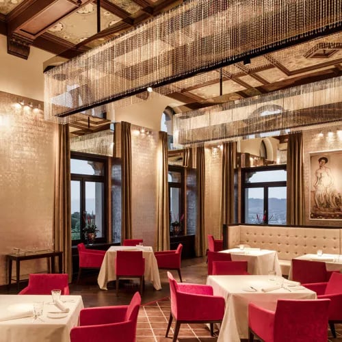 Philippe Starck reimagined this century-old lakefront palace as an imaginary yacht club, lining interiors with red wood evoking boat hulls, bronze Venetian gondola heads, and light timber floors recalling a Riva deck. The rooftop La Muña delivers Peruvian-Japanese fusion beneath monumental rafters with 360° terraces, while starred chef Marco Ortolani's Eden Kitchen draws locals for Mediterranean fare. Sunset cruises and the adjacent historic Seebad Utoquai complete the nautical immersion.