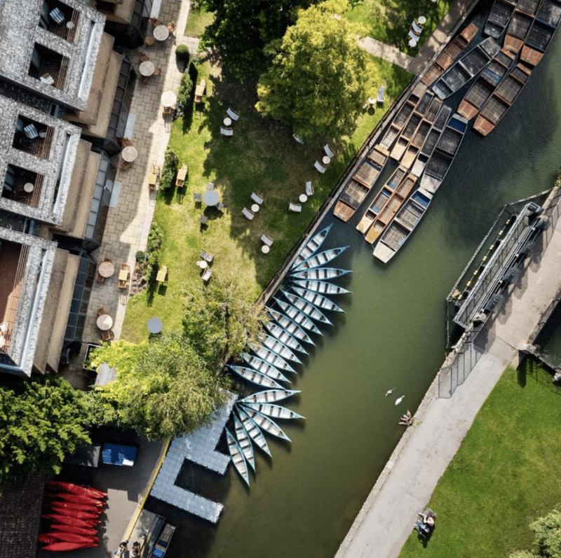 A riverfront address on Mill Lane places this 148-room property within walking distance of the colleges and the Fitzwilliam Museum. The lobby doubles as a gallery of sorts—vintage punting boats mounted on walls, heraldic crests flanking reception—while guest rooms layer saturated prints over traditional Cambridge references. The brand's first UK outpost suits visitors seeking design-conscious accommodation with direct access to the Backs.