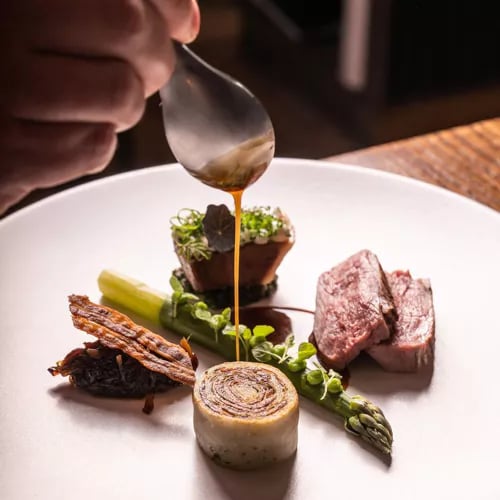 Occupying lavishly renovated premises in upscale Bearsden, Elements pairs royal blue fabrics with dark wood and gold accents to striking effect. The kitchen applies classical technique to prime Scottish produce—beef short rib arrives with beetroot, smoked eel, and beef dashi, demonstrating the subtle international influences at play. An on-display wine collection offers depth for every preference, making this a polished choice for considered neighbourhood dining.