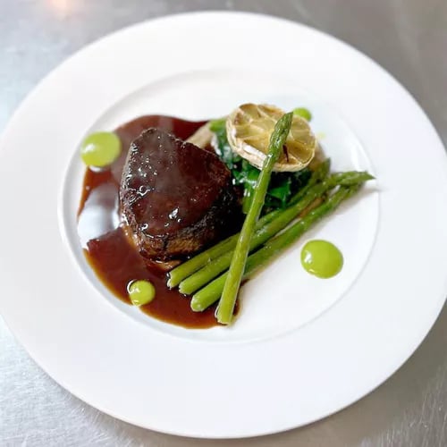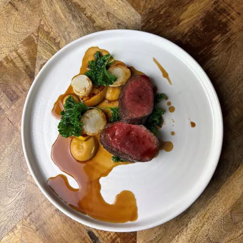 Malvern Hills unfold from the terrace of this Bib Gourmand country inn, where a New England-inflected dining room sets the stage for generous modern British cooking. The kitchen builds dishes around bold contrasts — pickled enoki cutting through rich red wine jus, starters sized like mains. Check the specials board for the sharpest value; the style-to-substance ratio here rewards the hungry.