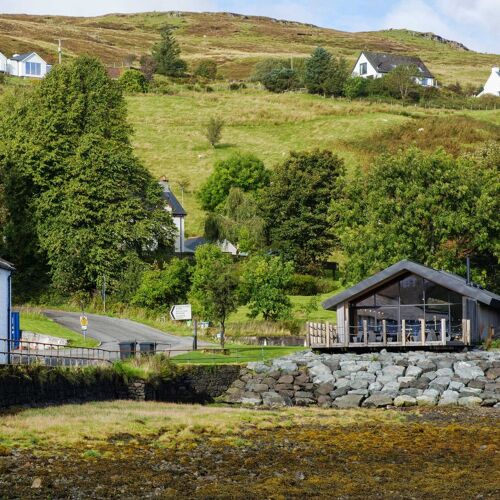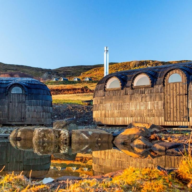 Twenty-seven peaked wooden cabins—called hides—climb a dramatic hillside within walking distance of Portree, creating a village-like retreat on Skye's rugged terrain. The main lodge anchors the experience with a refined restaurant and whisky bar stocked for serious sampling. Sauna facilities and the proximity to the island's charming capital suit travelers seeking both wilderness immersion and accessible creature comforts.
