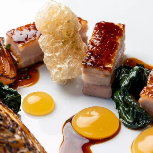 Claude Bosi brings decades of culinary precision to The Peninsula's rooftop, where a scale model of Concorde suspended overhead pays tribute to the legendary Surrey racetrack. His kitchen champions British terroir—Lake District lamb, Cornish squid—through technically exacting plates that balance delicacy with depth. Floor-to-ceiling windows frame sweeping terrace views, lending a sense of occasion to every course.