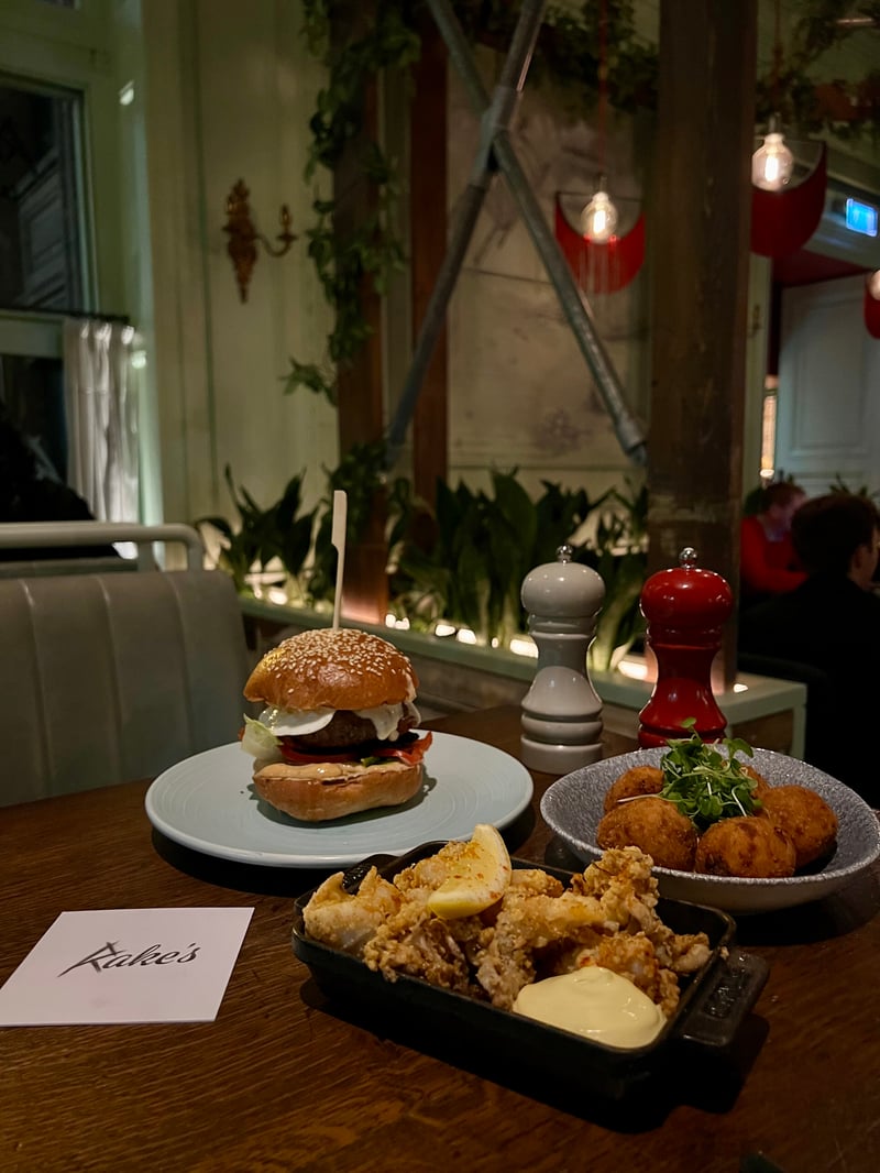 We explored Rake's Café Bar during a vibrant and lively dinner. The evening began with two expertly prepared drinks: a complex and robust cocktail called The Gamin House, a rich blend of bourbon, barolo, campari, and cognac, and a refreshing mocktail, a perfect balance of non-alcoholic flavors. On the culinary side, it was impossible to overlook the Rake's Hangover Burger made of ground beef, mushrooms, chipotle mayonnaise, fried egg, cheddar, bacon, caramelized onion, mustard, lettuce, and tomato. We also savored chicken and chorizo croquettes and crispy fried calamari. We concluded with a peach and cinnamon crème brûlée, a dessert that brilliantly capped our culinary experience with a subtle sweetness.
