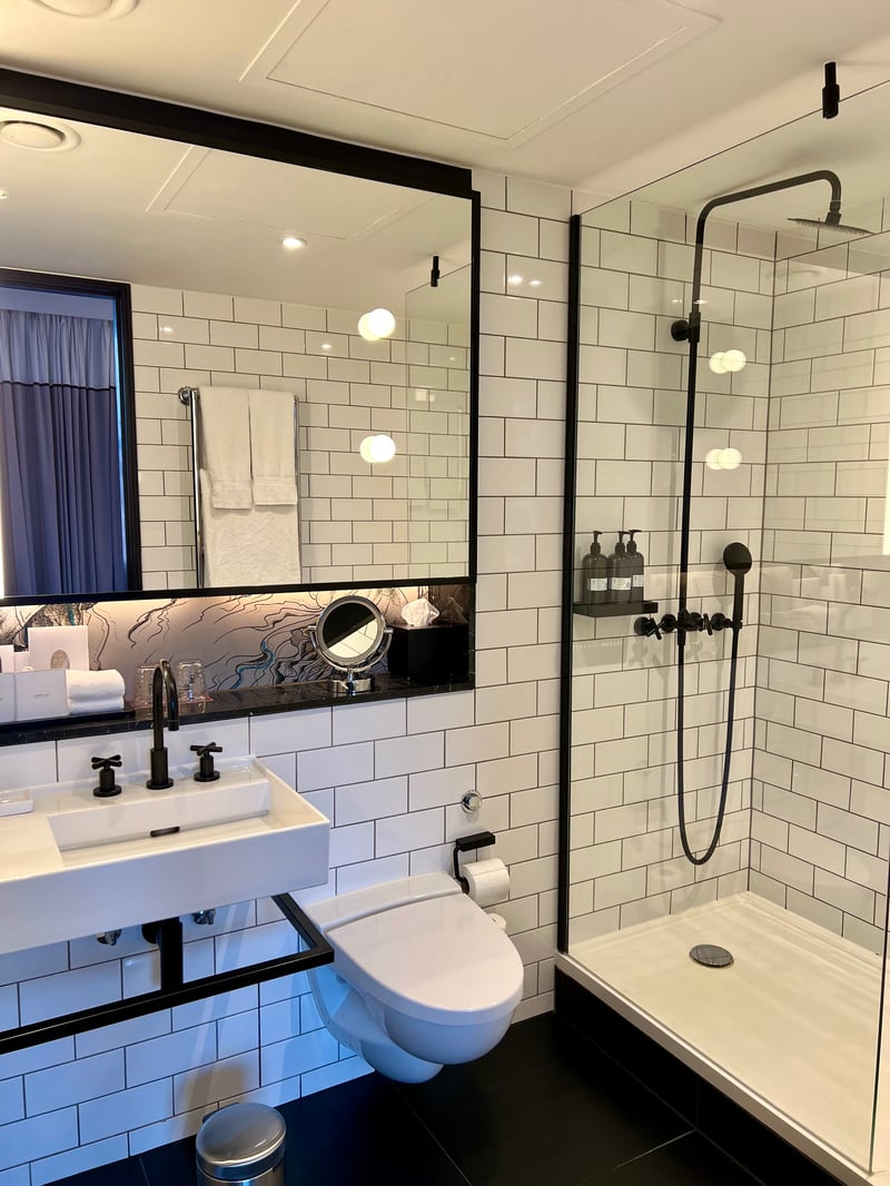 I had the opportunity to stay in one of the King Bed rooms, a remarkably spacious 28 sqm space that offers a magnificent view of the city's historic facades. This haven of peace is equipped with an exceptionally comfortable king-size bed, ideal for resting after a day in the city. The room also features a cozy reading chair, a large desk conducive to work, and a modern bathroom. This latter, with its walk-in shower and black and white brick walls, offers an elegant setting.