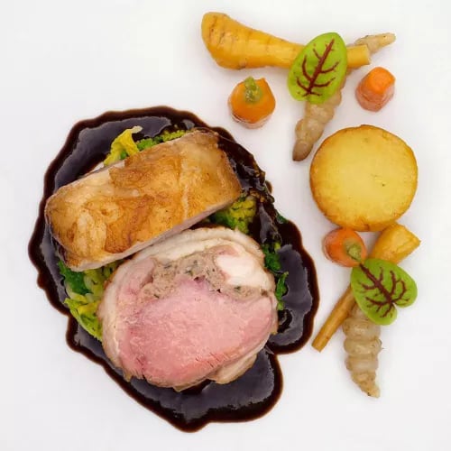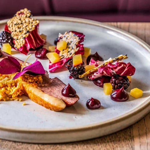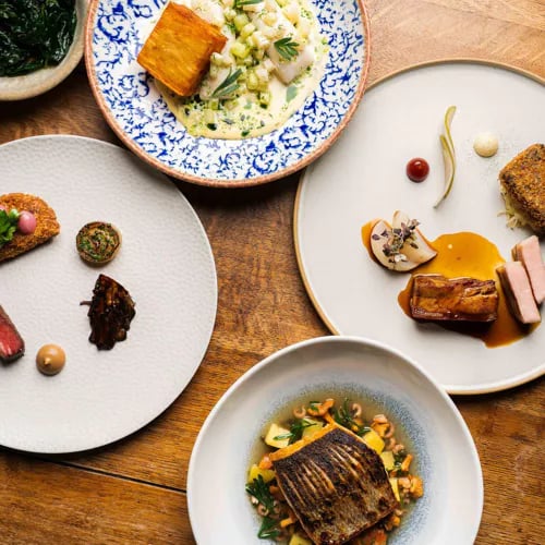 A timbered 14th-century inn in the village of Chelsworth, the Peacock holds a Bib Gourmand for accomplished cooking at accessible prices. The kitchen delivers confident dishes—roasted Gressingham duck arrives with a polished red wine sauce and fermented blackberries—while a garden terrace adds pastoral charm. Three menus, including a keenly priced set lunch, make skilled technique remarkably approachable.