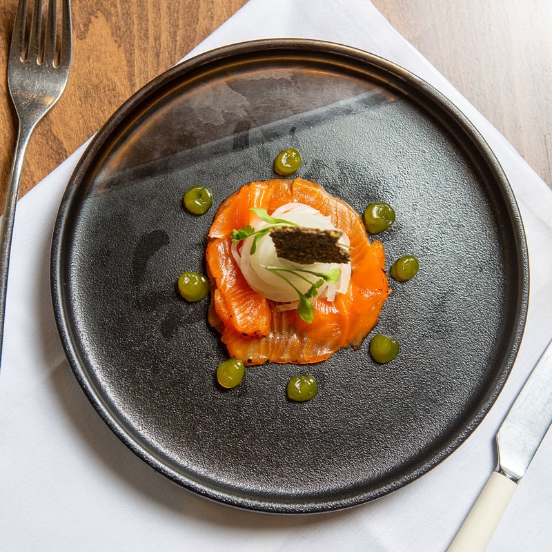 A 20-seat counter in Bury St Edmunds places diners inches from the action, where Spanish chef Ruben Aquilar Bel and his team cook and serve each plate themselves. The format shifts between sharing plates at lunch and a tasting menu at dinner, threading Spanish flavours through dishes like his grandmother's signature Iberian ham croqueta. His wife Gabi contributes house-made desserts and exceptional bread.