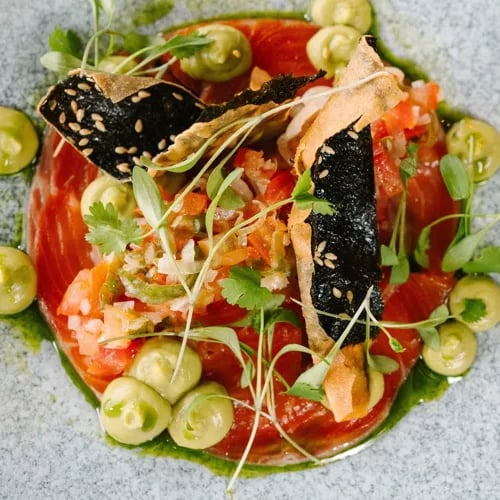 England's oldest commercial vineyard doubles as a destination table, its timber-and-glass dining room framing the chalk slopes of the South Downs. Ingredients travel mere steps from the kitchen garden to plates of sea bream paired with tomato risotto, while flutes of estate-grown sparkling wine punctuate the meal. A Michelin-recognized address for those seeking terroir-driven dining in the Hampshire countryside.