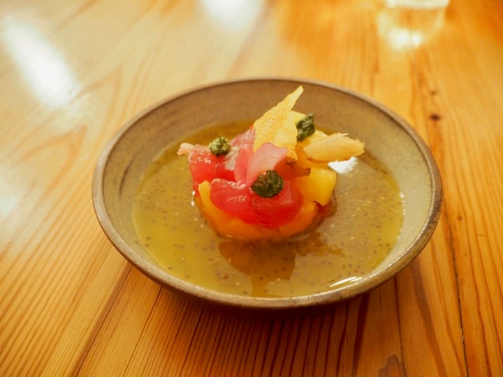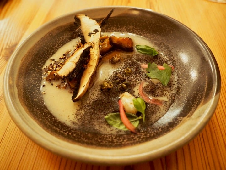 Il est temps de découvrir les premières assiettes : dès la mise en bouche avec le taco de yuca accompagné des légumes de saison, la barre est placée bien haute et nous transporte en un clin d'oeil au Mexique. Il est accompagné d'un maté, boisson traditionnelle d'Amérique du Sud proche du thé mais plus amer. C'est ensuite le ceviche de poisson, betterave, ananas, graines de chia, et leche de tigre qui nous emmène au Pérou avant de partir pour l'Equateur avec l'enconcado de poisson au lait de coco. Le 3ème plat sublime les champignons dans une sauce aji panca (piment du Pérou) mais peu relevée pour s'adapter à nos palais sensibles (demandé par notre part en début de repas).