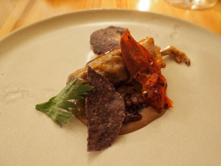 On retourne ensuite au Mexique avec la caille marinée à l'achiote, accompagnée de sauce mole, de tortilla au mais et d'haricots noirs, le tout dans une assiette d'une superbe élégance et d'une modernité sans faille. On poursuit avec la joue de bœuf réduite dans du café colombien et du sucre de canne, une viande tendre à souhait !
