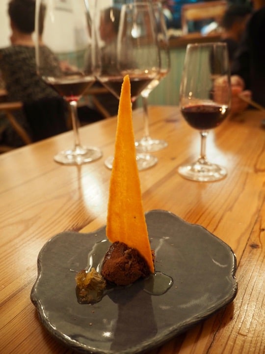 C'est maintenant au tour des douceurs de faire leur apparition : le premier dessert est une truffe de cacao accompagnée d'huile d'olive. Surprenant me direz-vous mais absolument régressif dès la première cuillère en bouche. Le mélange du sucré et du salé est terriblement addictif ! Le 2ème dessert fait son apparition : Chamoy (condiment mexicain), sorbet à la mangue, tequila et meringue, le tout subtilement relevé par le condiment ce qui donne un résultat détonnant ! On clôture ce délicieux dîner par le cérémonial du café qui achève notre voyage culinaire en Colombie.