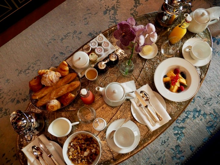 Le lendemain matin, j'ai commandé en quelques secondes notre petit déjeuner en chambre (pas besoin de laisser sa commande sur la porte le soir, on peut directement téléphoner et cela à n'importe quelle heure de la journée !). Une vingtaine de minutes après, il est dressé sur la table du salon. Encore une fois l'hôtel de Crillon se surpasse avec un petit déjeuner exquis : les viennoiseries sont excellentes tout comme les autres mets, un régal des papilles et l'un des meilleurs petits déjeuners de la capitale.