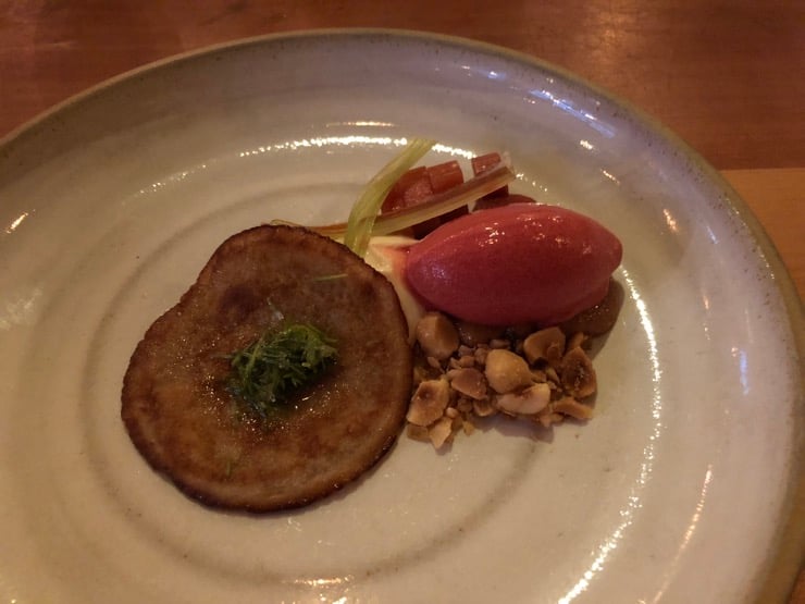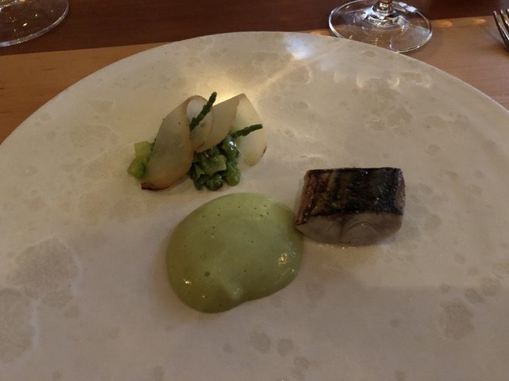 Le menu commence par un maquereau doucement fumé accompagné de petits pois et de fleurs de sureau. Suivra la sandre fumée au genévrier et les champignons flambés au foin, ris de veau et salsifis. Le plat d'agneau fait son entrée, cuit au bois de bouleau qui lui donne une saveur délicieuse, il se marie parfaitement avec le chou et les câpres. Pour terminer sur une note sucrée, ce sera une crêpe flambée à l'épicéa avec de la rhubarbe et des noisettes, un dessert qui m'a vraiment emballé. Les différents plats sont absolument délicieux et le goût du fumée est une vraie valeur ajoutée, c'est bien différent d'une cuisson plus « classique ». J'ai quand même regretté que la quantité des plats soit si minime : même en ayant un petit appétit je suis ressortie sans être rassasiée …