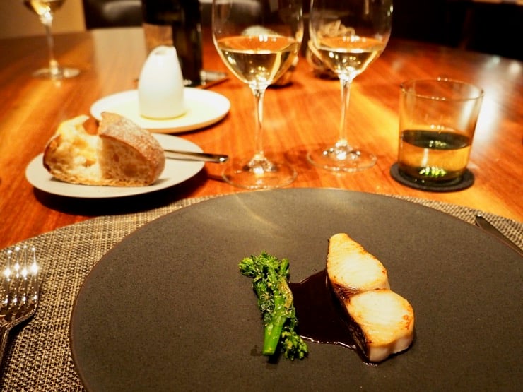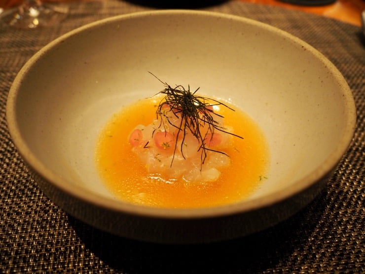 Dans les starting-blocks, nous attendons patiemment le défilé des plats. Des mises en bouche nous permettent de patienter avant d'attaquer l'entrée : la daurade « leche de tigre », nom de la marinade dans laquelle les morceaux de poisson cru se sont imprégnés. C'est frais, rafraîchissant et subtil ! En suivant, nous avons les asperges blanches accompagnées de benimadoka (agrume japonais) et de shungiku (chrysanthème japonais comestible) puis le sawara (poisson proche du maquereau) mariné dans une sauce miso qui fait écho aux notes japonaises. Dans les assiettes, on retrouve la simplicité chère à l'esprit Troisgros et cela avec un dressage très élégant.