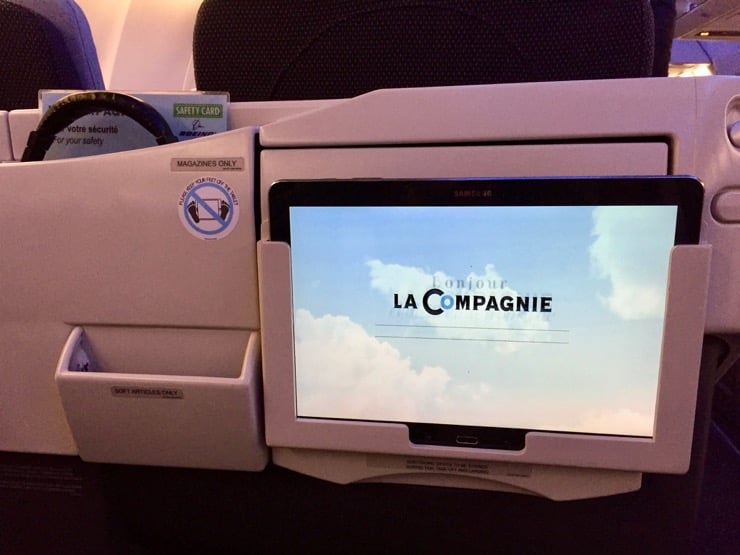 Quelques dizaines de minutes d'attente et nous voilà à bord de notre Boeing. L'accueil administré par les 3 hôtesses est très chaleureux et professionnel. Nous nous installons à bord et découvrons le fameux siège où nous allons passer plus de 7 heures de vol. Du côté des divertissements, ce sera une tablette Samsung qui nous permettra de visionner des films, de lire des magazines ou bien d'écouter de la musique. Le concept est très sympa et permet de prendre la tablette en main pour lire, bien plus agréable.