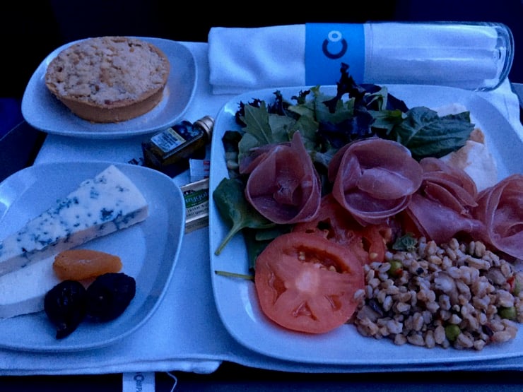 Après le décollage, les hôtesses nous servent un snack froid et rapide qui permettra à l'ensemble des passagers de dormir quelques heures avant d'arriver à Paris. Les menus à bord sont crées par le chef Christophe Langrée et nous avons dégusté ce soir une salade jambon mozzarella, une sélection de fromages et pour finir un crumble à la pomme, le tout accompagné de champagne ou de vin pour ceux qui le souhaitent. La qualité des mets, est pour un repas en vol, de très bonne facture, qualitatif et gouteux. Après cela, la cabine adopte une lumière tamisée dans les tons bleutés, très chaleureuse et agréable qui nous permet de tomber dans les bras de Morphée pour quelques heures.