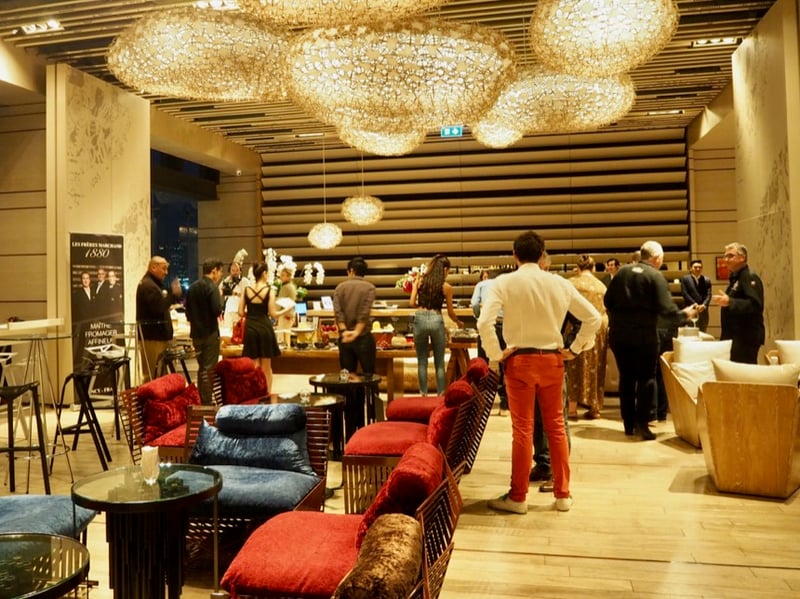 Direction le 9ème étage où se situe le lobby mais aussi le bar Mixo où va se dérouler la soirée. Il est 19h il fait quasiment nuit mais nous pouvons encore deviner la vue sur la parc Lumpini tout proche. La déco du bar et de l'hôtel tout entier a été supervisée par Christian Lacroix en personne qui a été le directeur artistique, autant vous dire que le ton est donné !