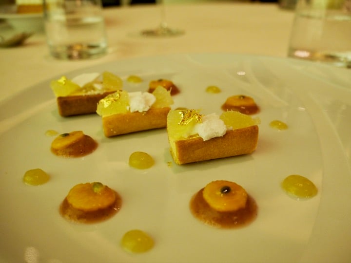 Après les mises en bouche, nous avons débuté le dîner avec la pastèque confite, burrata et câpres, une immersion toute en fraicheur pour ma part, tandis que mon mari s'est régalé avec le foie gras poêlé, sirop de gingembre, coulis de mangue pour des notes typiquement françaises. J'ai poursuivi avec le saint-pierre, poireaux et jus d'artichaut et mon mari avec le bœuf Black Angus, oursins et céleri. Un véritable feu d'artifice des saveurs!