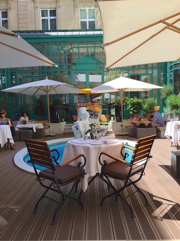 L'adresse en soit est déjà une bénédiction, à mi chemin entre la très célèbre place Vendôme et le jardin des Tuileries. A peine a-t-on franchit les imposantes portes d'entrée que l'on se trouve face à cette cour intérieure dès plus spacieuse. C'est dans cet environnement exceptionnel que le restaurant Le First s'installe pendant l'été pour proposer au choix un brunch, un déjeuner ou un diner. Une petite fontaine trône au centre de la terrasse tandis que les tables sont disséminées ça et là. La clientèle est plutôt hétéroclite, collègues venus déjeuner rapidement en ce jeudi midi, couples mais aussi groupes de copines, qui profitent de l'une des plus belles terrasses parisiennes.