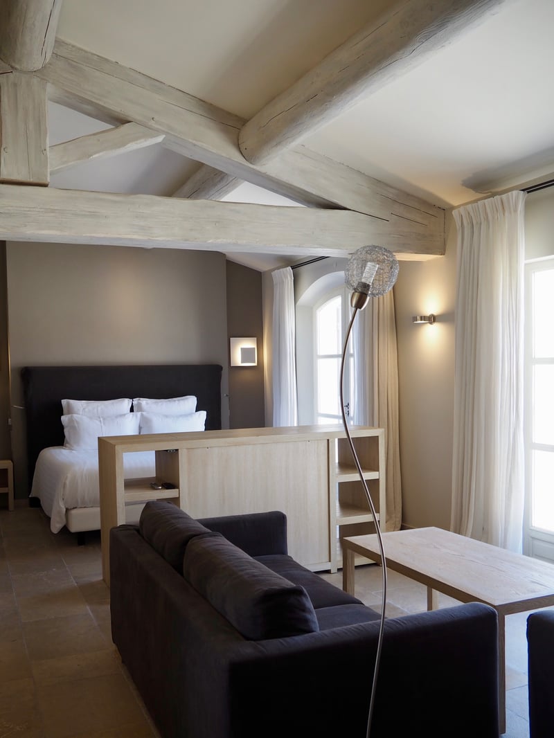 Bien que le domaine soit immense, l'établissement affiche seulement 63 chambres dont 42 suites. Notre suite junior, toute en élégance, affiche une décoration lumineuse qui fait écho à l'esprit provençal chic et contemporain. Murs de pierre, boiseries et enduits à la couleur de Roussillon, le respect de l'authenticité des lieux, dont certains murs datent du 11ème siècle, est préservé. Les intérieurs combinent à la fois des matériaux d'art local mais aussi des lignes épurées signées par de grands noms du design à l'instar de Philippe Starck. Quant à la salle de bain, c'est un jacuzzi complété d'une douche hammam qui ont fait notre bonheur !
