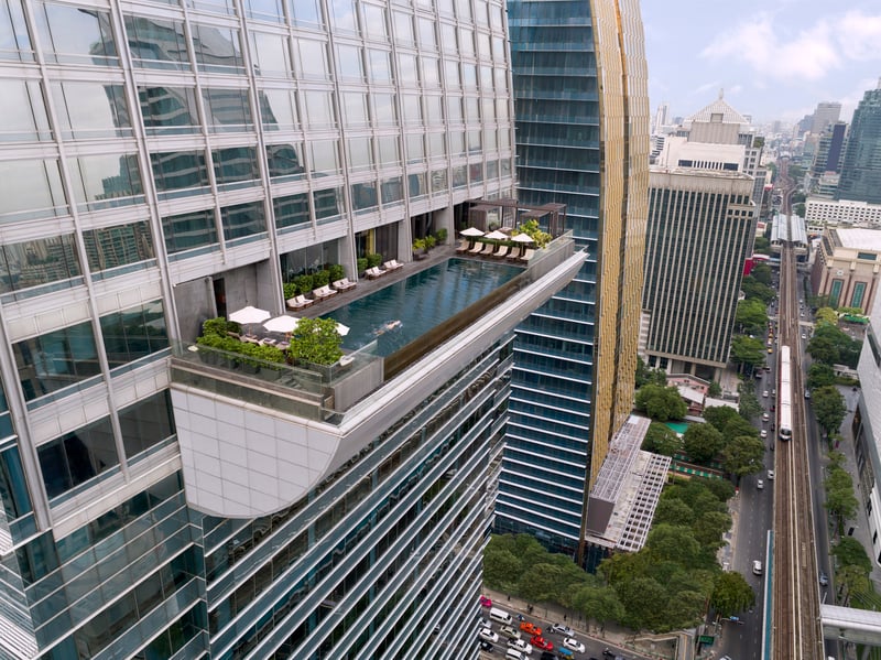 Perchée au 25ème étage, la piscine à débordement est une prouesse architecturale. Elle semble littéralement flotter dans les airs et la vue sur le magnifique building du Central Embassy donne un cachet urbain indéniable à la vue.