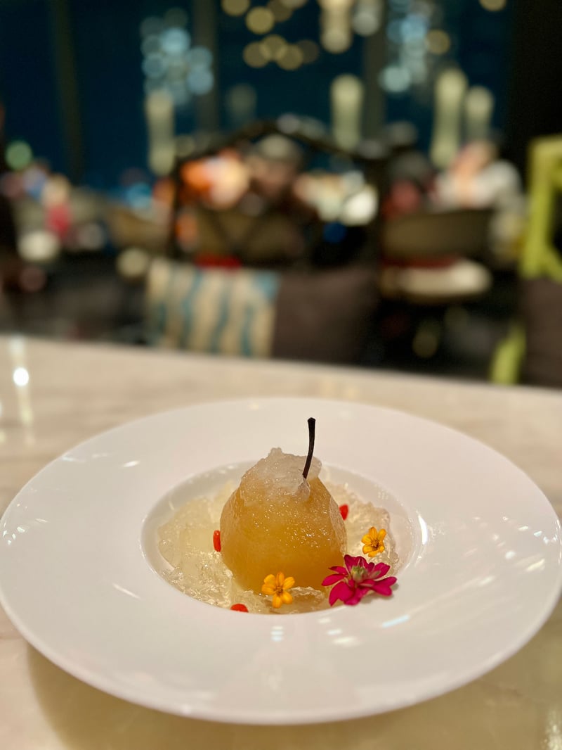 Le dîner a commencé par un des plats phares du restaurant, le plateau Shanghai 6 Éléments, composé de canard rôti, de morue à la sauce soja, de salade de poulet, de porc croustillant, de porc BBQ et de salade de méduse. Ce plat nous a immédiatement immergés dans les saveurs cantonaises tant appréciées. Le repas s'est ensuite enchaîné avec un poisson frit enveloppé dans des feuilles de thé oolong et de sauce soja, présenté sur une feuille de lotus, accompagné de riz gluant aux noix de Saint-Jacques royales, de nouilles de style Pékin et de haricots verts frits avec du tofu séché. Pour conclure sur une note rafraîchissante, nous avons choisi une poire pochée dans du thé de chrysanthème accompagnée de nid d'oiseau, une spécialité cantonaise très prisée.