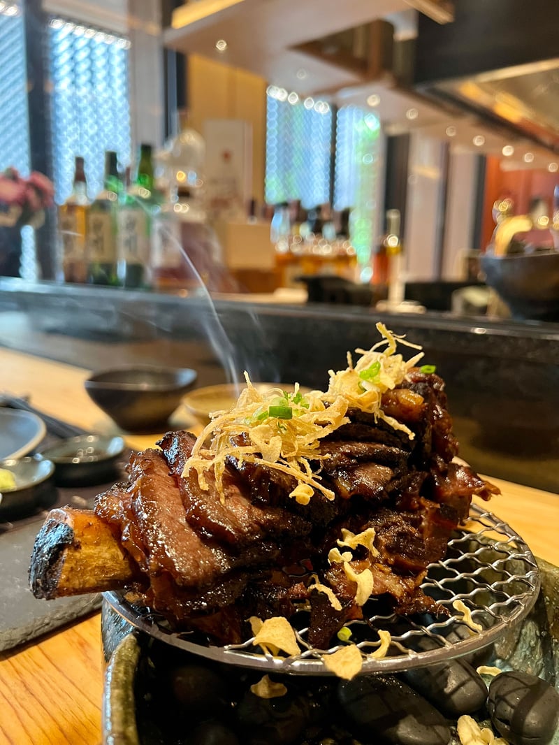 Notre déjeuner au Chi Izakaya a été une immersion dans un univers vibrant et chaleureux. Le menu met en avant des mets préparés avec du charbon de bois binchotan pour son parfum unique. Nous avons porté notre dévolu sur le gyu tataki, un wagyu délicatement rôti accompagné de sauce ponzu, l'ishimi masumori, un assortiment de sashimi, et le tuna maki sushi, composé de sept pièces de maki au thon. Nous avons également savouré le takowasabi & tai shiokara, un poulpe au wasabi et ventre de dorade salé, le dashimaki tamago, une omelette japonaise, et notre favori, le karubi yaki, des travers de bœuf avec une sauce soja spéciale qui se distingue par sa tendresse et son goût exquis. Le repas s'est conclu sur une note sucrée avec le kasutera, un gâteau d'origine portugaise devenu une spécialité réputée au Japon.
