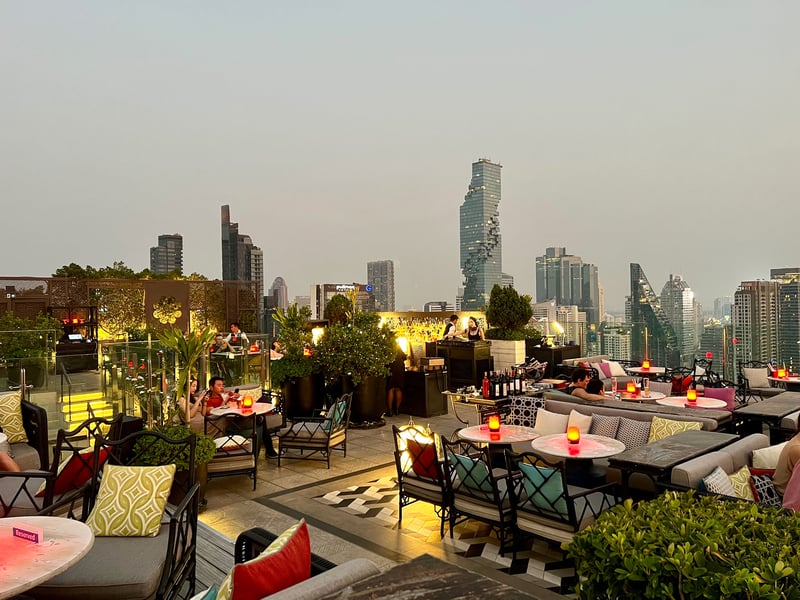 Notre soirée a débuté en apothéose au dernier étage de l'hôtel, au Yao Rooftop Bar. Imprégné d'une élégance chinoise, cet espace nous invite à déguster des cocktails rafraîchissants tout en embrassant du regard l'horizon urbain de Bangkok. La vue panoramique est à couper le souffle, offrant un spectacle à 360 degrés qui juxtapose la modernité des gratte-ciels à l'authenticité de la vieille ville et à la sérénité de la rivière Chao Phraya. Les boissons sont accompagnées de bouchées légères, et l'atmosphère est sublimée par des mélodies lounge, créant un cadre idéal où touristes et expatriés se rencontrent et partagent des moments mémorables.