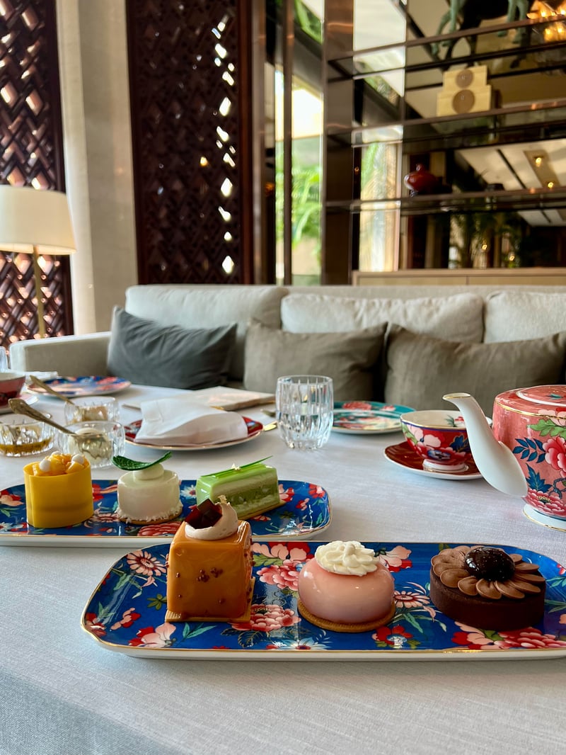 L'expérience se poursuit avec un assortiment de mets salés, suivi des traditionnels scones, servis avec de la confiture et de la clotted cream. Un chariot à desserts fait ensuite son apparition, dévoilant une variété de pâtisseries fines et saisonnières qui intègrent des saveurs thaïlandaises, témoignant du savoir-faire technique et de la créativité du chef.