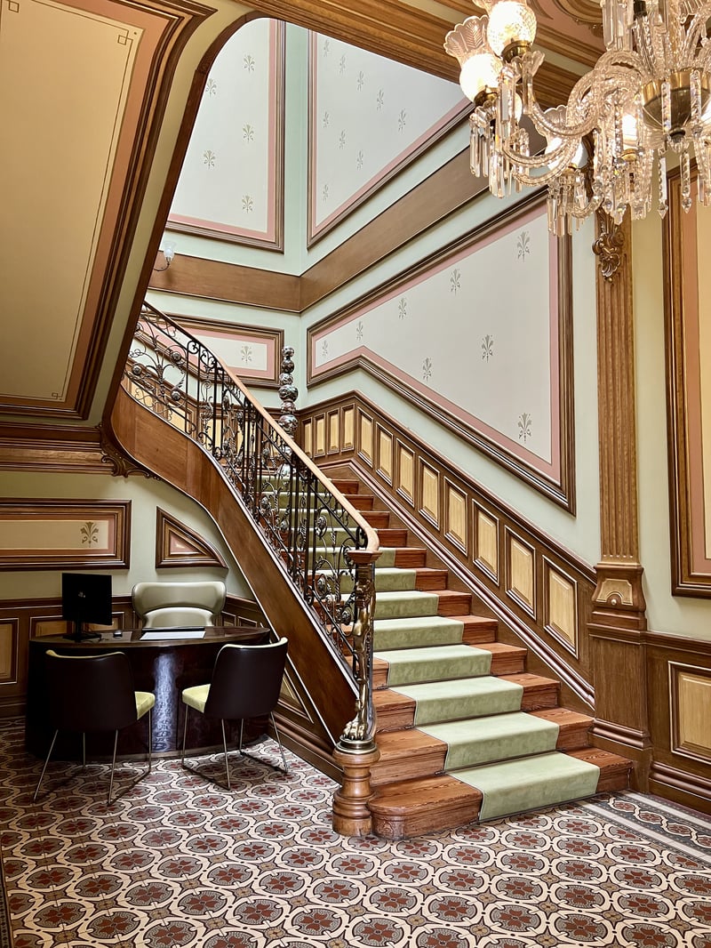 La designer Nini Andrade Silva a magistralement intégré des matériaux novateurs tels que l'onyx pour enrichir le patrimoine architectural de la Vila Foz. Cet élément distinctif est utilisé avec audace dans les salles de bains et inspire également les motifs des papiers peints des chambres. Dans l'extension moderne, l'onyx joue un rôle central : il décore la zone entourant la piscine et se reflète dans les motifs ondulants des couloirs et les tapis d'un vert vibrant, évoquant les mouvements des vagues de l'océan tout proche. Ces lignes fluides tissent un lien visuel entre la maison principale, les chambres modernes et le spa, créant une continuité thématique et esthétique.