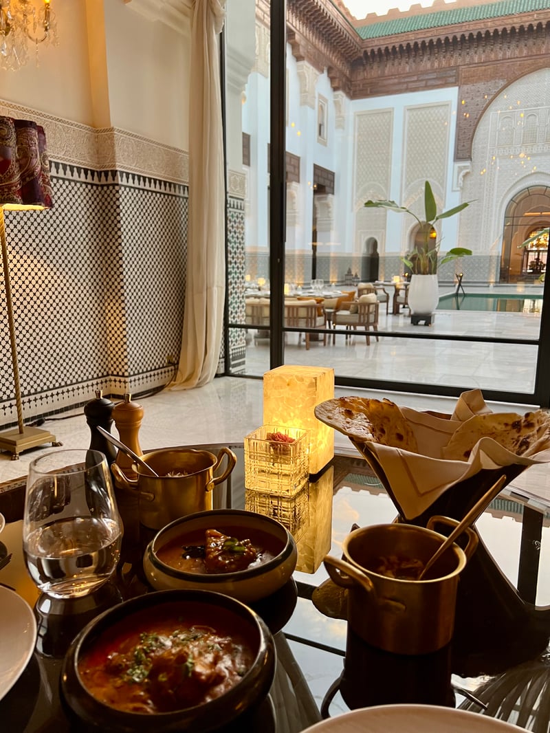 À l'extérieur, le majestueux patio, inspiré de la Medersa Ben Youssef, offre un cadre idyllique pour un repas en plein air, où les tables disposées au bord du bassin permettent d'apprécier pleinement la beauté architecturale des lieux. La vaisselle raffinée signée Raynaud, accompagnée de contenants en métal typiquement indiens, complète cette expérience visuelle et sensorielle unique.
