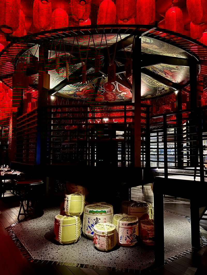 Perché au 9ème étage, le restaurant Ronin offre une expérience culinaire qui marie tradition japonaise et modernité vibrante, le tout avec une vue imprenable sur Dubaï. Dès leur arrivée, les guests sont accueillis par un décor saisissant, où les murs sont ornés de samouraïs peints à la main et de motifs rappelant les tatouages traditionnels japonais, rendant hommage au ronin, les samouraïs sans maitre pendant la période féodale. Le style du restaurant évoque l'essence du Japon ancien, avec ses tables de pagode qui créent une atmosphère intime, et une certaine modernité avec ses stations de sushi bar et de teppanyaki où les chefs démontrent leur savoir-faire avec élégance. La musique house, subtilement présente, ajoute une touche de dynamisme sans jamais perturber la conversation, créant une atmosphère parfaite pour un dîner festif.