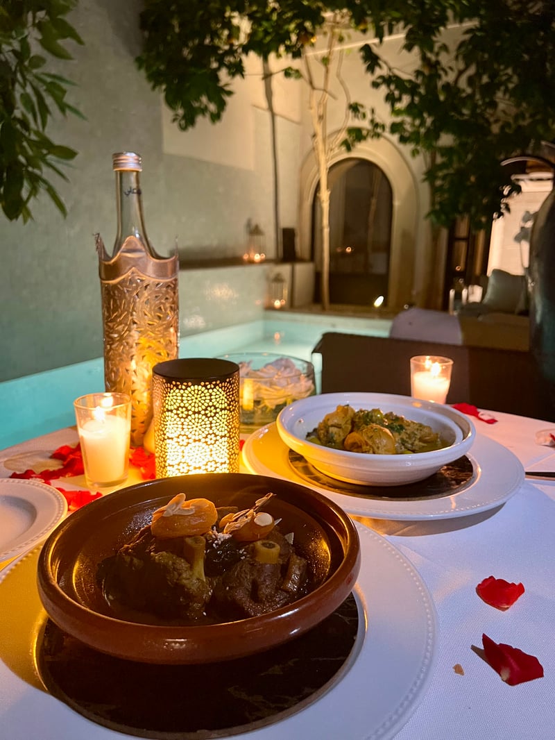 Nous avons eu le privilège de dîner en toute intimité dans le patio au bord de la piscine, une attention ultra romantique que le riad a organisée avec soin. Le cadre était tout simplement enchanteur, avec une table élégamment dressée d'une grande nappe blanche, parsemée de pétales de roses. Ce moment à deux restera gravé dans nos mémoires, tant il a été marqué par la beauté et l'intimité du décor, créant une atmosphère propice à un instant privilégié.