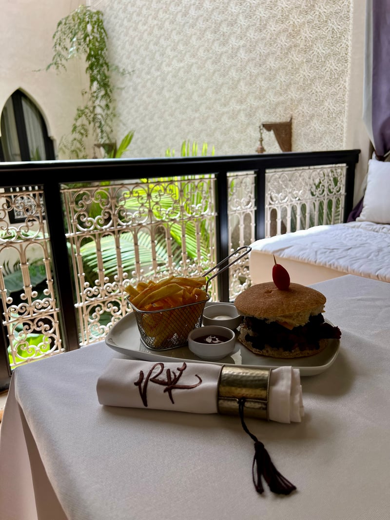Le riad offre également un excellent room service, disponible à tout moment, que vous soyez dans votre chambre ou dans l'une des élégantes parties communes. Nous avons eu l'occasion d'en profiter dès notre arrivée, en commandant un déjeuner rapide et léger que nous avons savouré sur notre terrasse privée, dans un cadre intime et paisible.