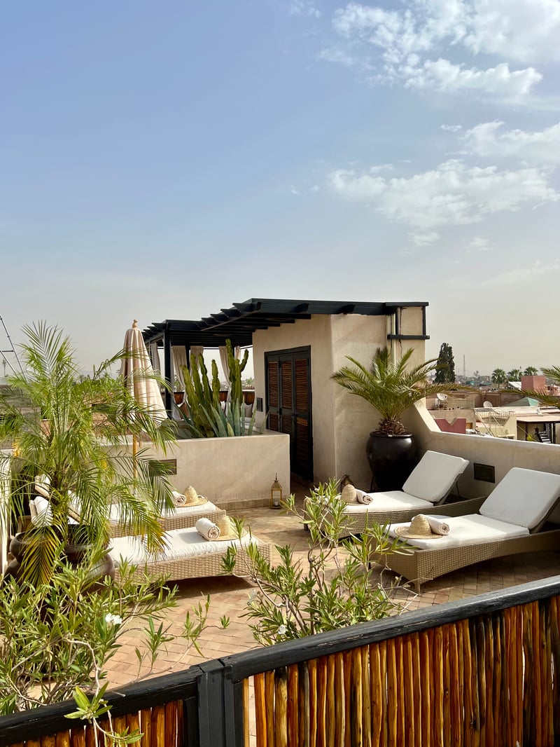 Les chambres, réparties sur trois étages, sont accessibles via des escaliers sinueux menant à une splendide terrasse sur le toit. Ce véritable espace de vie en plein air, avec des transats, des coins salons ombragés, une piscine chauffée et un espace restaurant, offre une vue imprenable sur les toits de la médina et les montagnes de l'Atlas, invitant à une détente absolue. Cette seconde piscine est, quant à elle, idéale pendant la saison hivernale où le soleil est le bienvenu pour se réchauffer.