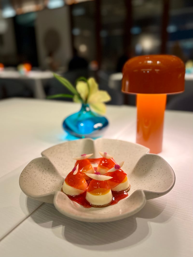 Les plats principaux ont suivi avec un bar poêlé accompagné de moules, relish dabu dabu, daikon, émulsion de crustacés au gingembre, ainsi qu'un pad thaï aux crevettes qui nous a immédiatement plongés en Thaïlande. Côté desserts, le Sea Fu Cloud, avec sa meringue légère et croustillante, marmelade daAmarena, chantilly sakura et sorbet à la cerise, a été un véritable délice, tout comme le cheesecake au yuzu et fruit de la passion, agrémenté de poire nashi pochée et d'une sauce aux baies de goji et hibiscus.